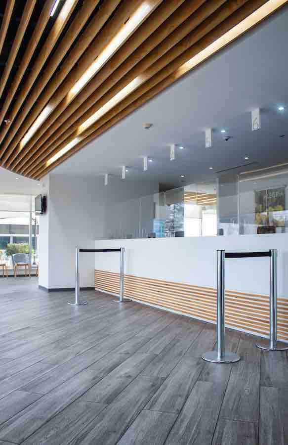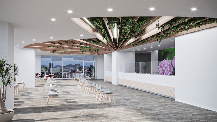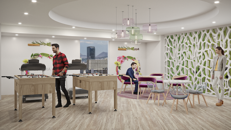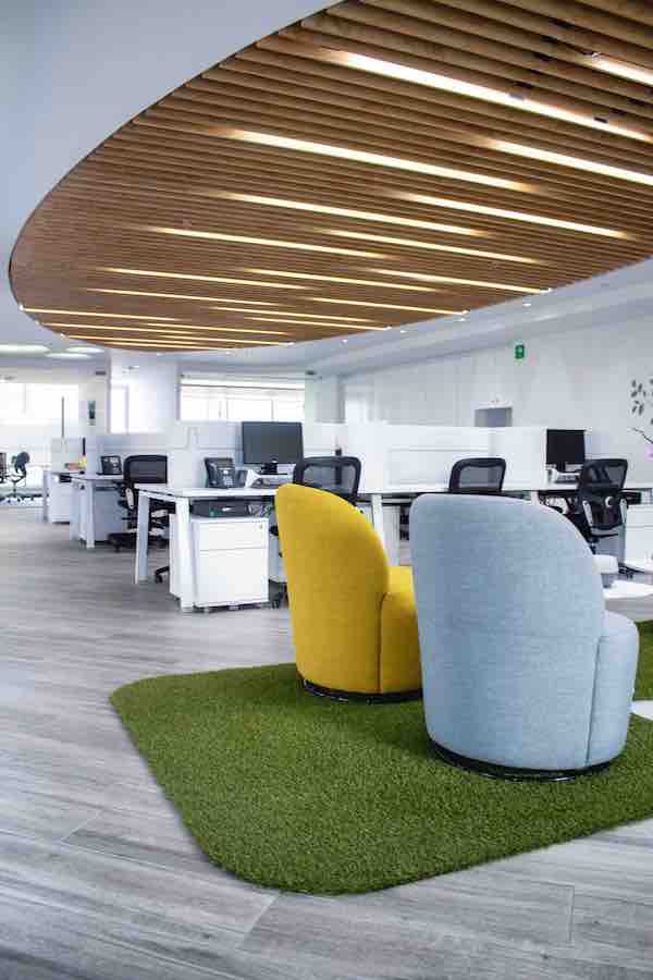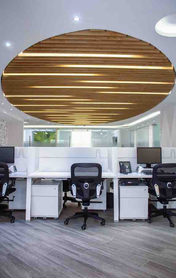 El área de call center es un espacio abierto compuesto por módulos de mobiliarios lineales, y en color blanco, la sobriedad de este espacio tiene un acento visual en el plafón en forma ovalada compuesto por tiras de panel acusativo en una gama de verdes. Los privados, oficinas y salas de juntas están enmarcados por cancelería con cristal para dar la sensación de transparencia y amplitud. En la cocina el mobiliario blanco esta realzado por una tapicería en verde y un plafón en madera arruada con luz led.