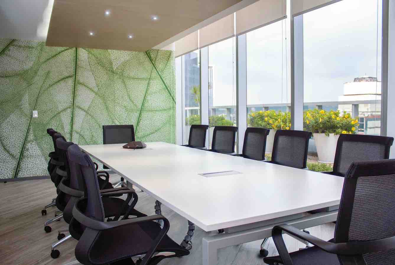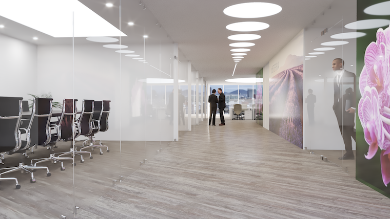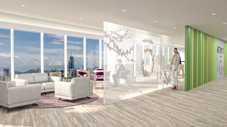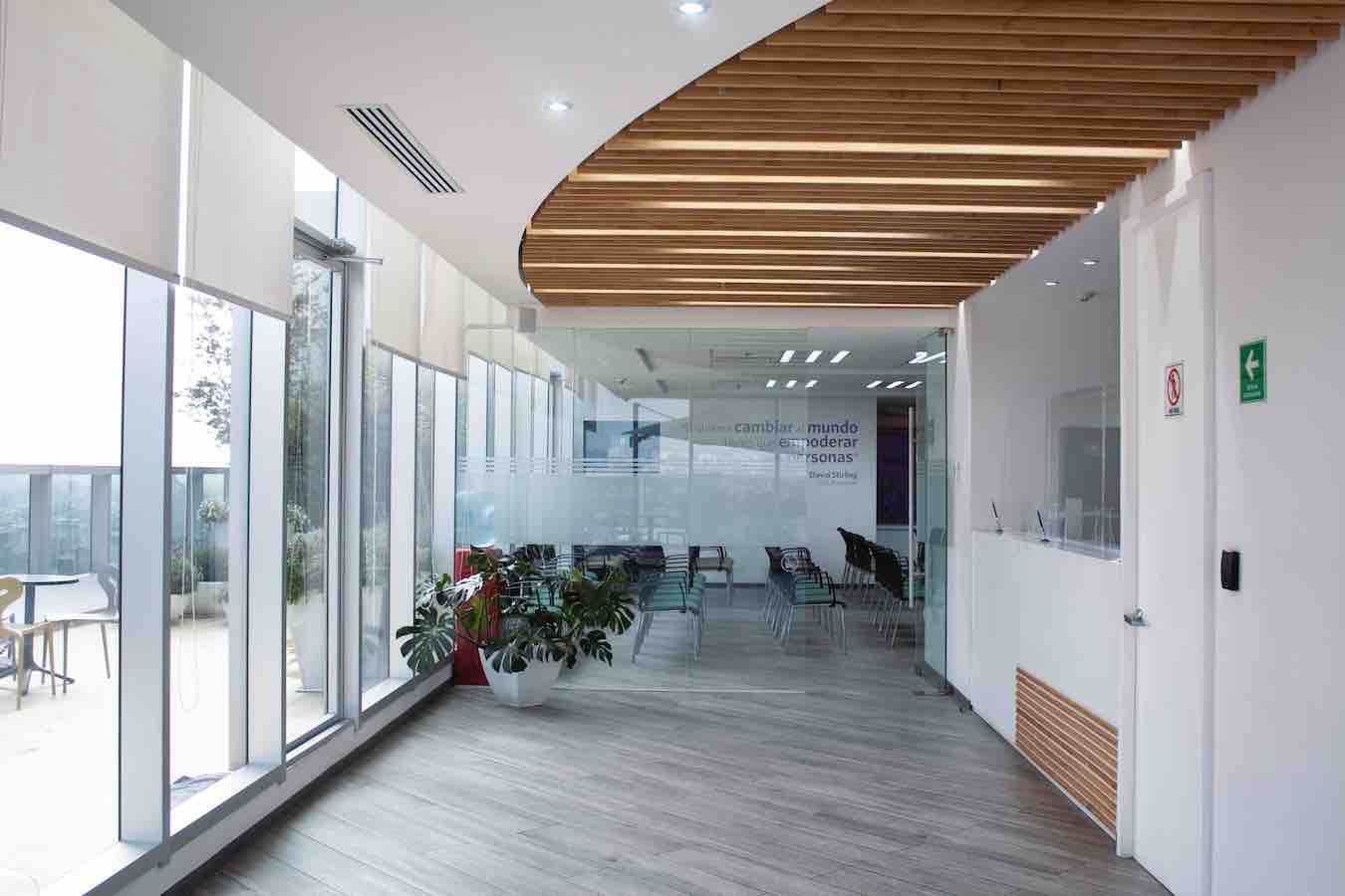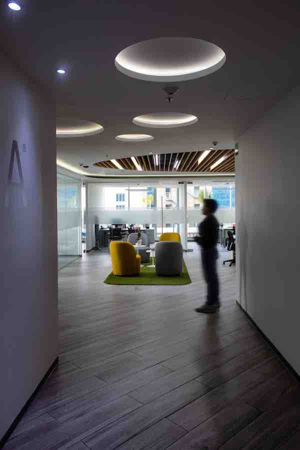 En general en el proyecto se utilizaron colores neutros con acentos de color y cajillos con luz en los plafones de algunas circulaciones y áreas de mayor jerarquía como la sala de juntas. Los acabados, colores, y limpieza del espacio se conjugan para crear un ambiente de armonía y con ese toque natural que va de la mano con la imagen corporativa.