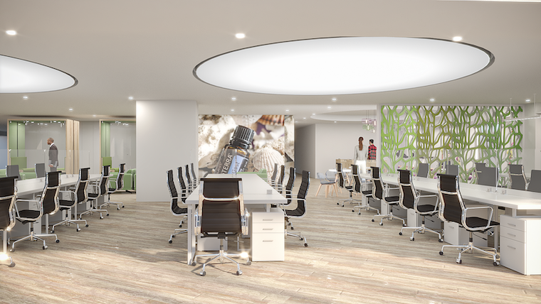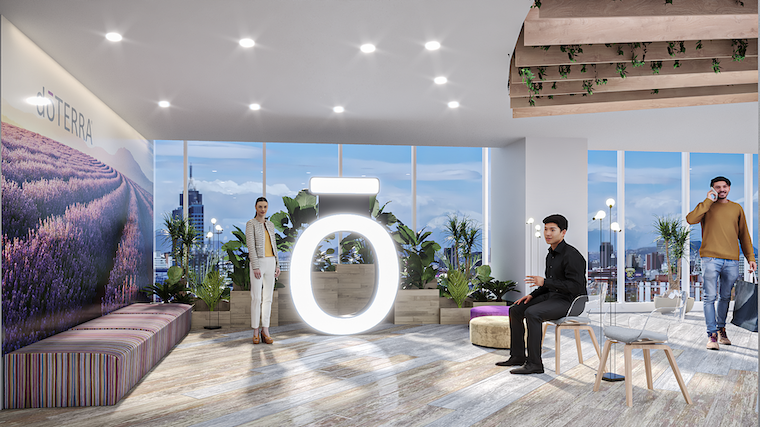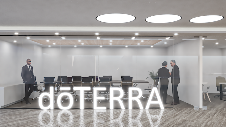 Doterra es una empresa dedicada a la venta de aceites naturales para aromaterapia, la imagen corporativa utiliza color gris y morado con énfasis en la naturaleza, por lo que en todo el proyecto se utilizó en el piso un lambrín cerámico con acabado en madera colocado a 45 grados para dar dinamismo. En el acceso y sala de distribuidores se tiene el punto focal, un gran plafón radial de tiras de madera con iluminación led.