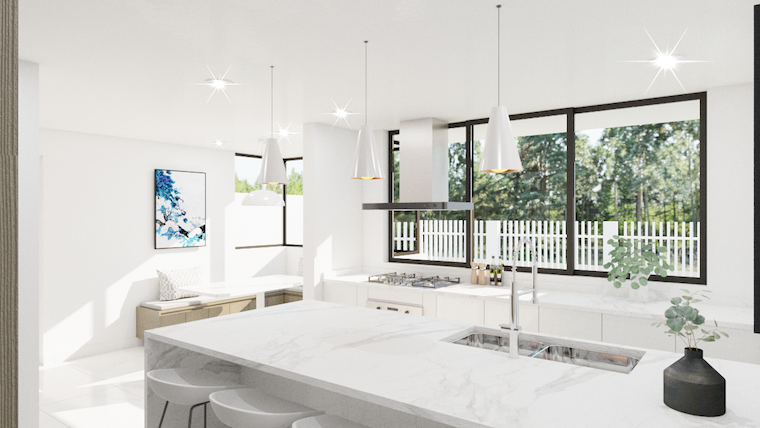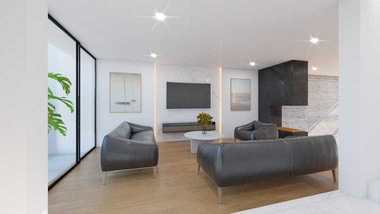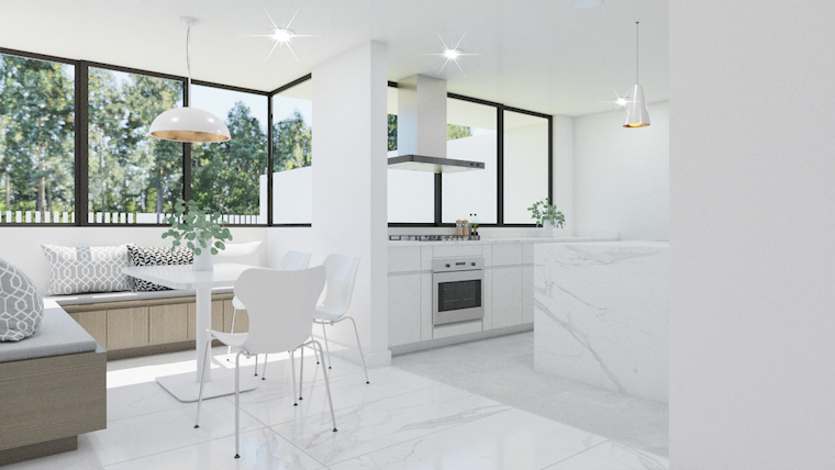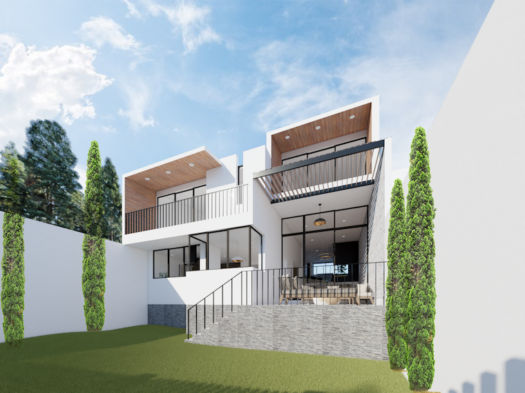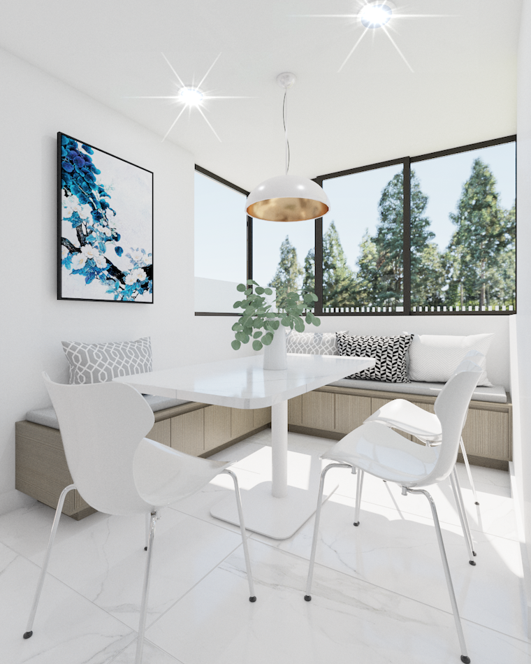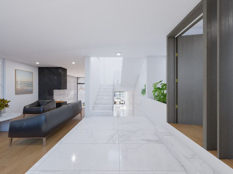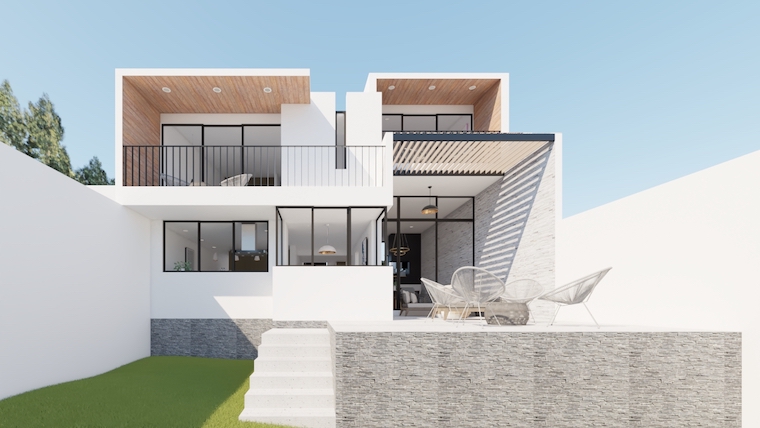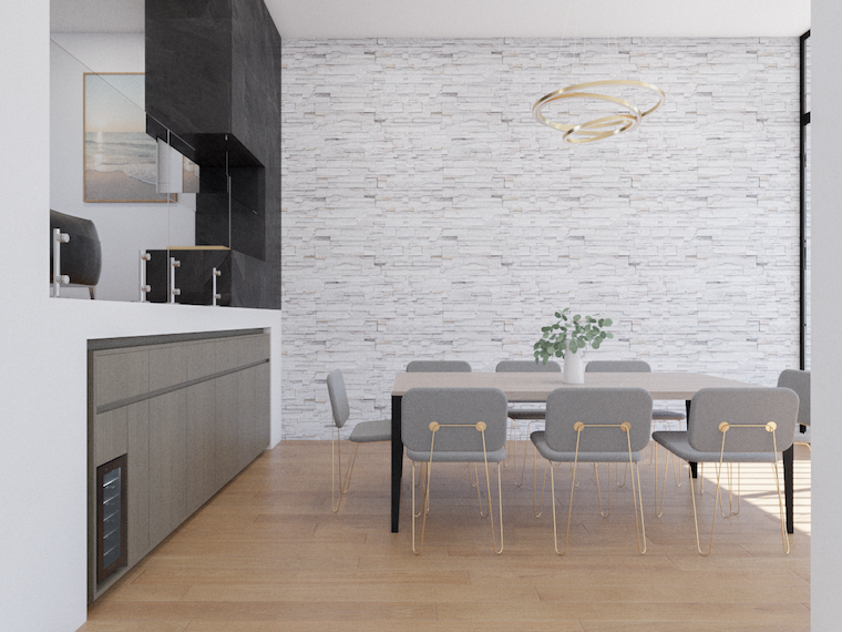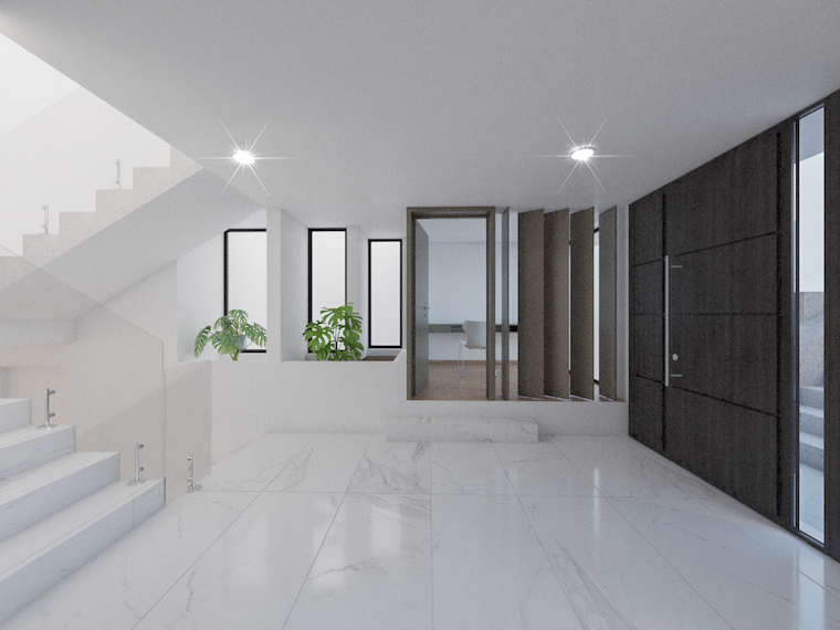 El proyecto tiene varias particularidades que lo destacan, las cuales se pueden ver en los renders que se realizaron con dicha finalidad. El manejo de los acabados fue en tonos neutrales para mantener una misma paleta cromática en toda la casa. La selección del mobiliario también se mantuvo en esos tonos grises y el piso en tono madera. El área de antecomedor se mantienen los tonos blancos y se usaron diferentes texturas en los accesorios que se implementaron en el espacio. Cabe mencionar que la cocina esta conectada con el área del antecomedor y se mantiene el uso de estos colores, materiales y mobiliario, destacando la isla al centro de la cocina con acabados tipo mármol.