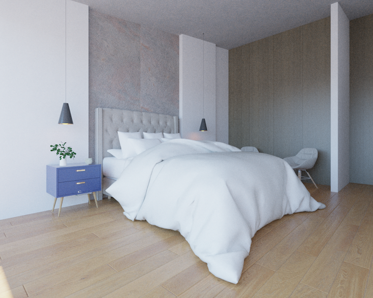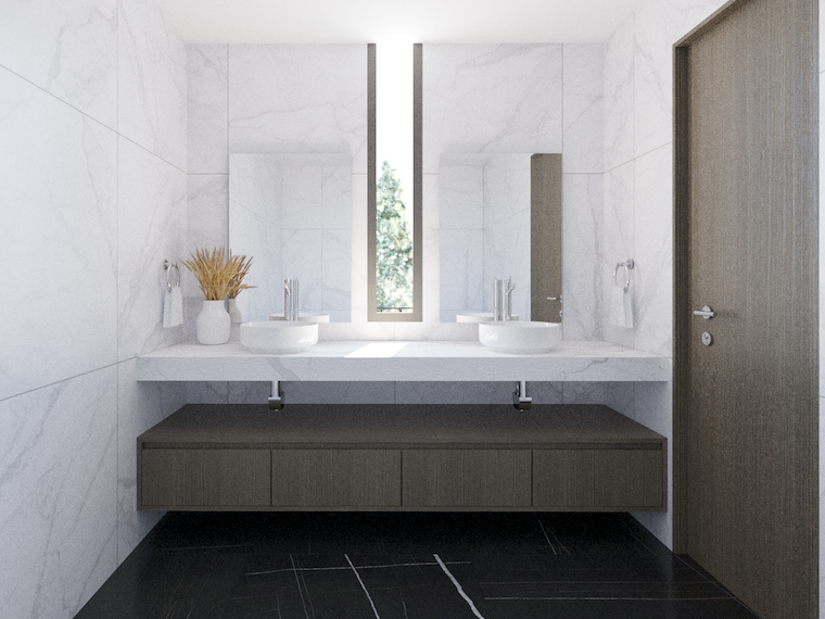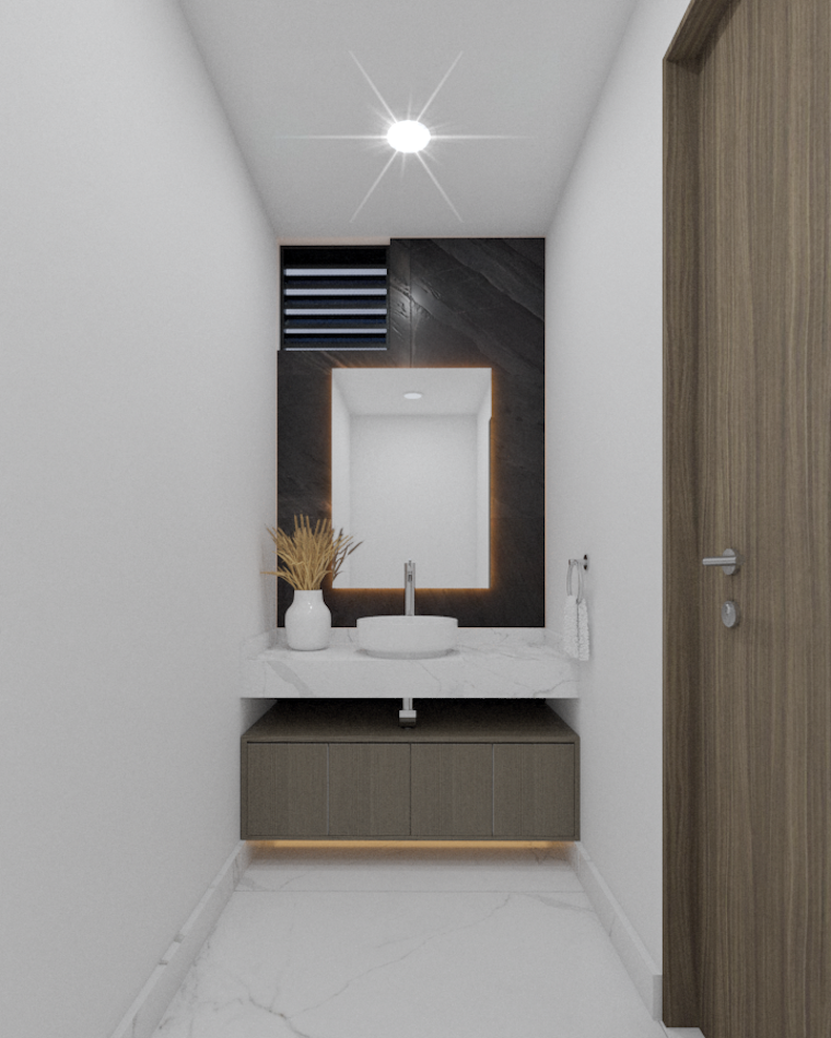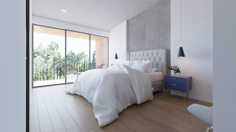 La recámara principal se mantiene con colores blancos y grises, y algunos toques de color en el mobiliario, pero siempre respetando el espacio destinado al descanso, además de que tiene acceso directo al balcón que tiene vista al patio. El baño principal tiene dos lavabos para mejor disposición del espacio y uso por los futuros habitadores, además de que se mantuvo el acabado tipo mármol para seguir la uniformidad de los materiales.