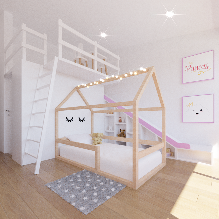 La recámara de la niña de la familia se trabajó en tonos blancos, además de un diseño divertido para el desarrollo y crecimiento de ella.