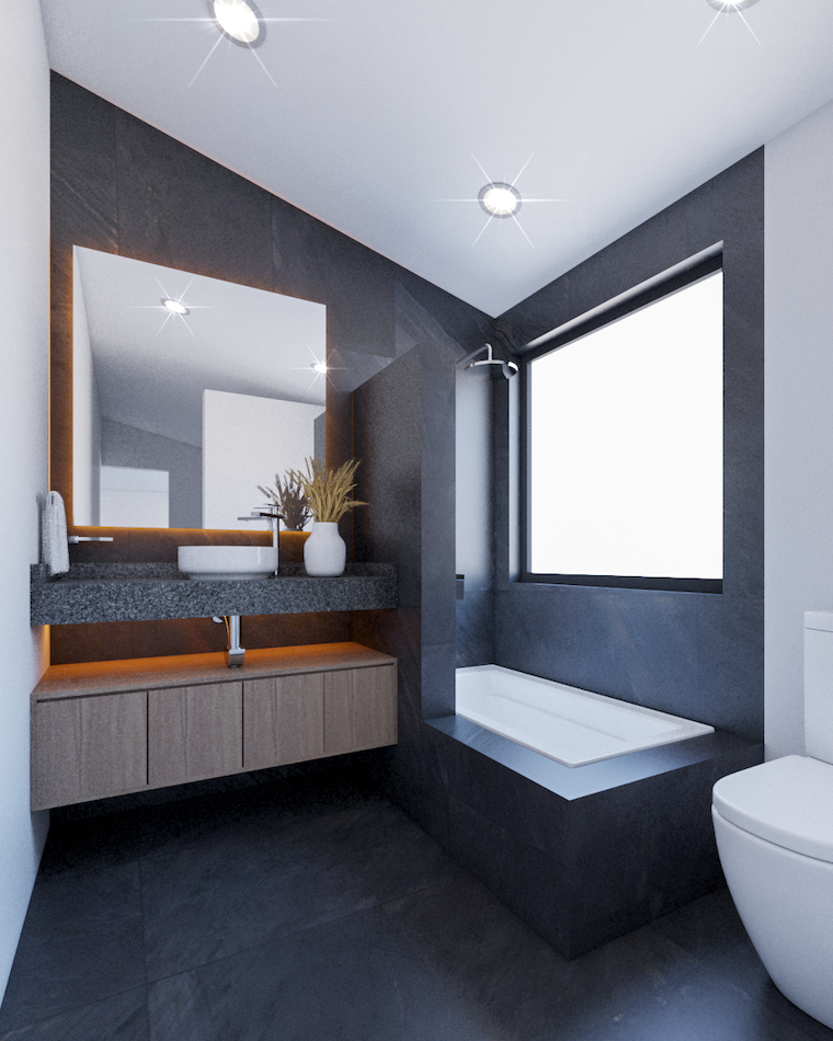Los baños se mantienen con colores blancos y como remate de color en el muro donde se encuentra el lavabo y el mueble se pintó de un tono azul oscuro.