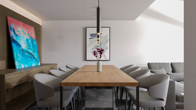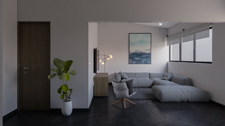 En el área de sala – comedor se mantuvo una paleta cromática neutral, cuidando la selección de propuesta de mobiliario, para que reflejara un poco de la personalidad del cliente. Un elemento importante que destaca en todo el diseño es la carpintería donde se encuentra el mueble de entretenimiento y la tv, además de se mantiene una conexión interior – exterior a través de la cancelería que divide la terraza y la sala.